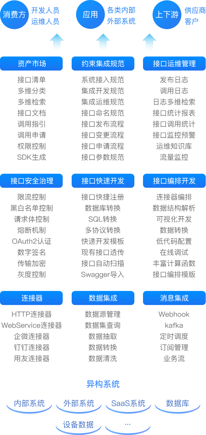 开发效率搭建企业统一、可扩展的集成平台,实现内部系统互联互通