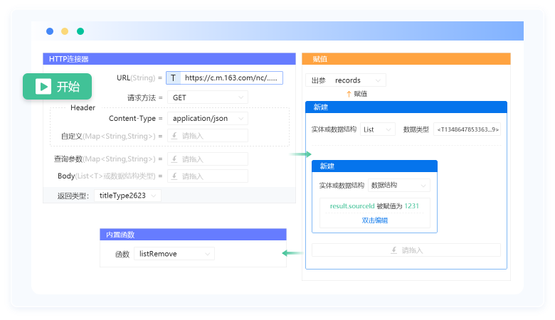 通过可视化拖拽配置就可编排重组企业已有的服务资产,构建新API服务或集成方案。